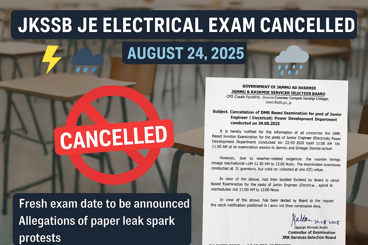 🔘👉🏻 Srinagar, Aug 24 (JKNS): The Jammu and Kashmir Services Selection Board (JKSSB) on Sunday announced the cancellation of the OMR-based written examination for the posts of Junior Engineer (Electrical), Power Development Department, which was conducted earlier in the day.