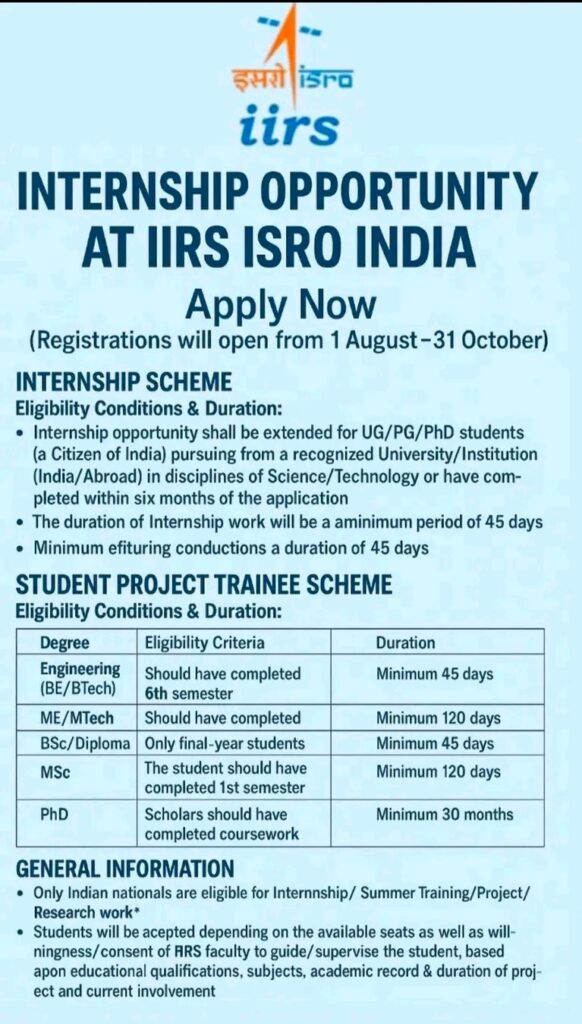 The Indian Institute of Remote Sensing (IIRS), a premier center under the Indian Space Research Organisation (ISRO), has opened its doors to aspiring scientists and engineers for a transformative internship experience. From **1 August to 31 October**, students across India and abroad can apply to be part of cutting-edge space research and remote sensing projects.