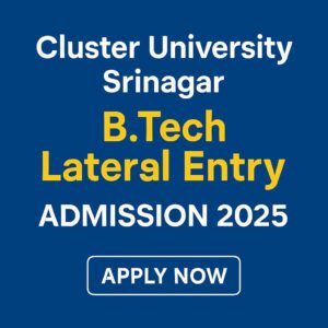 Spread the love                WhatsApp channel Join Now Telegram Group Join Now Instagram Group Join Now 🎓 Cluster University Srinagar B.Tech Lateral Entry Admission 2025: Apply Now!   Cluster University Srinagar has officially announced its Admission Notification No. 06 CUS of 2025 for the B.Tech Engineering Programme (Lateral Entry Scheme) for the academic session 2025–26. If