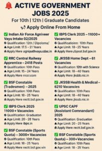 Spread the love              Here’s a polished and engaging article you can publish or share: WhatsApp channel Join Now Telegram Group Join Now Instagram Group Join Now 🔔 Active Government Jobs 2025 For 10th, 12th & Graduate Candidates | 📢 Apply Online from Home Looking to kickstart your career in the public sector? Whether you’re a fresh